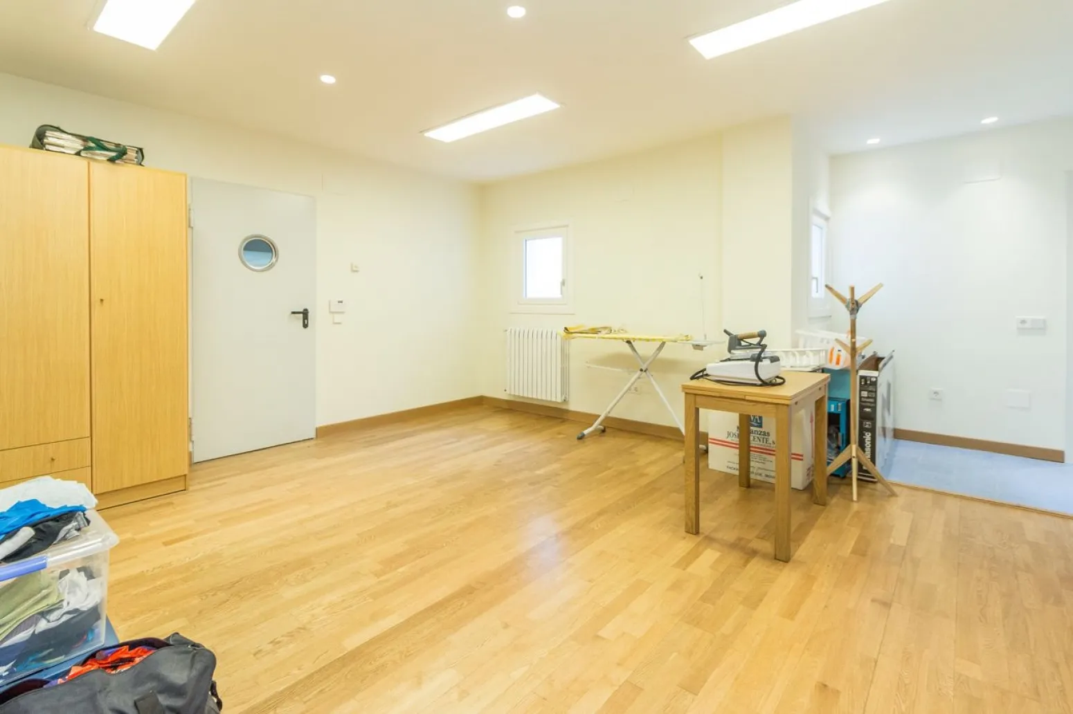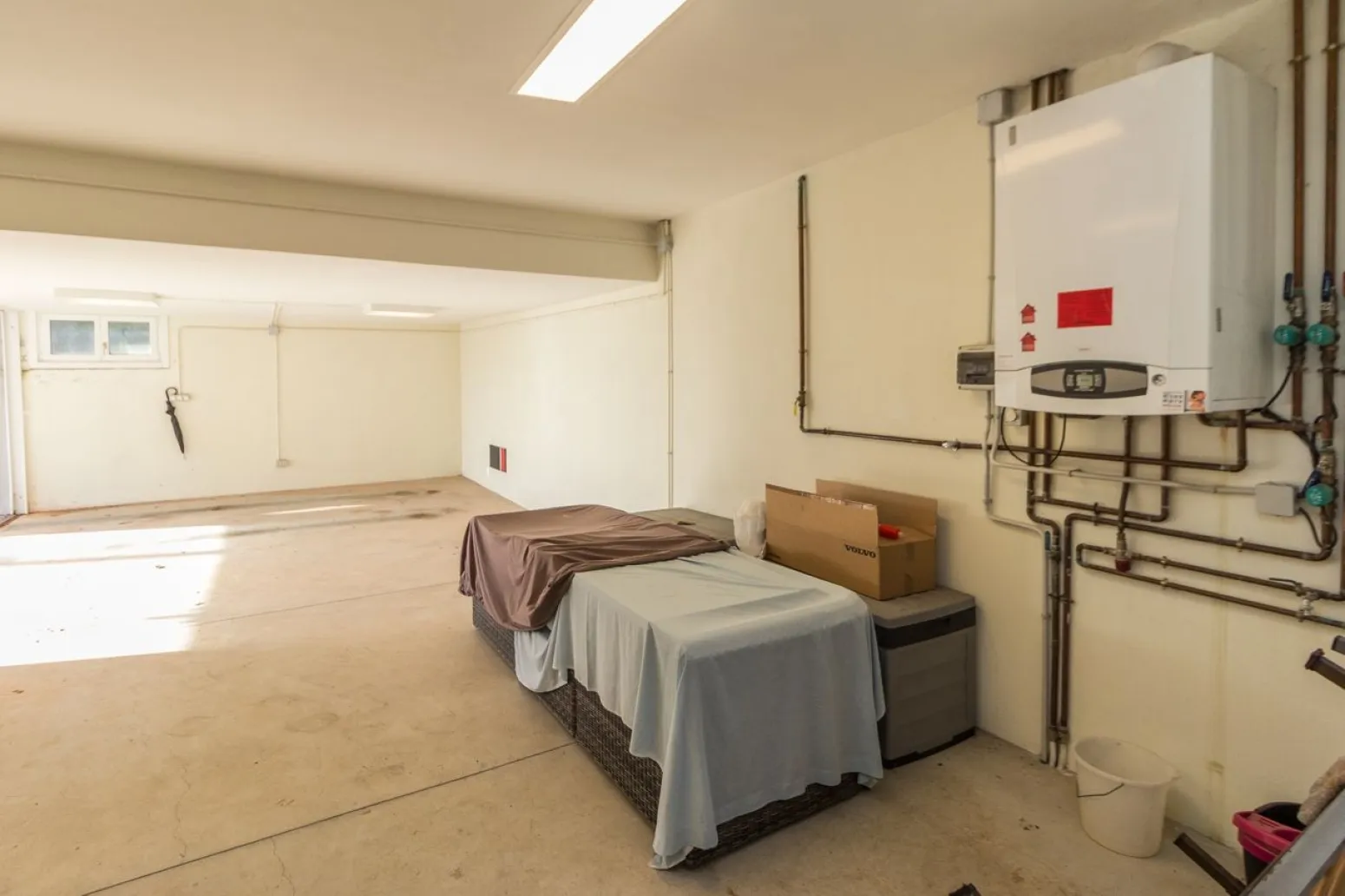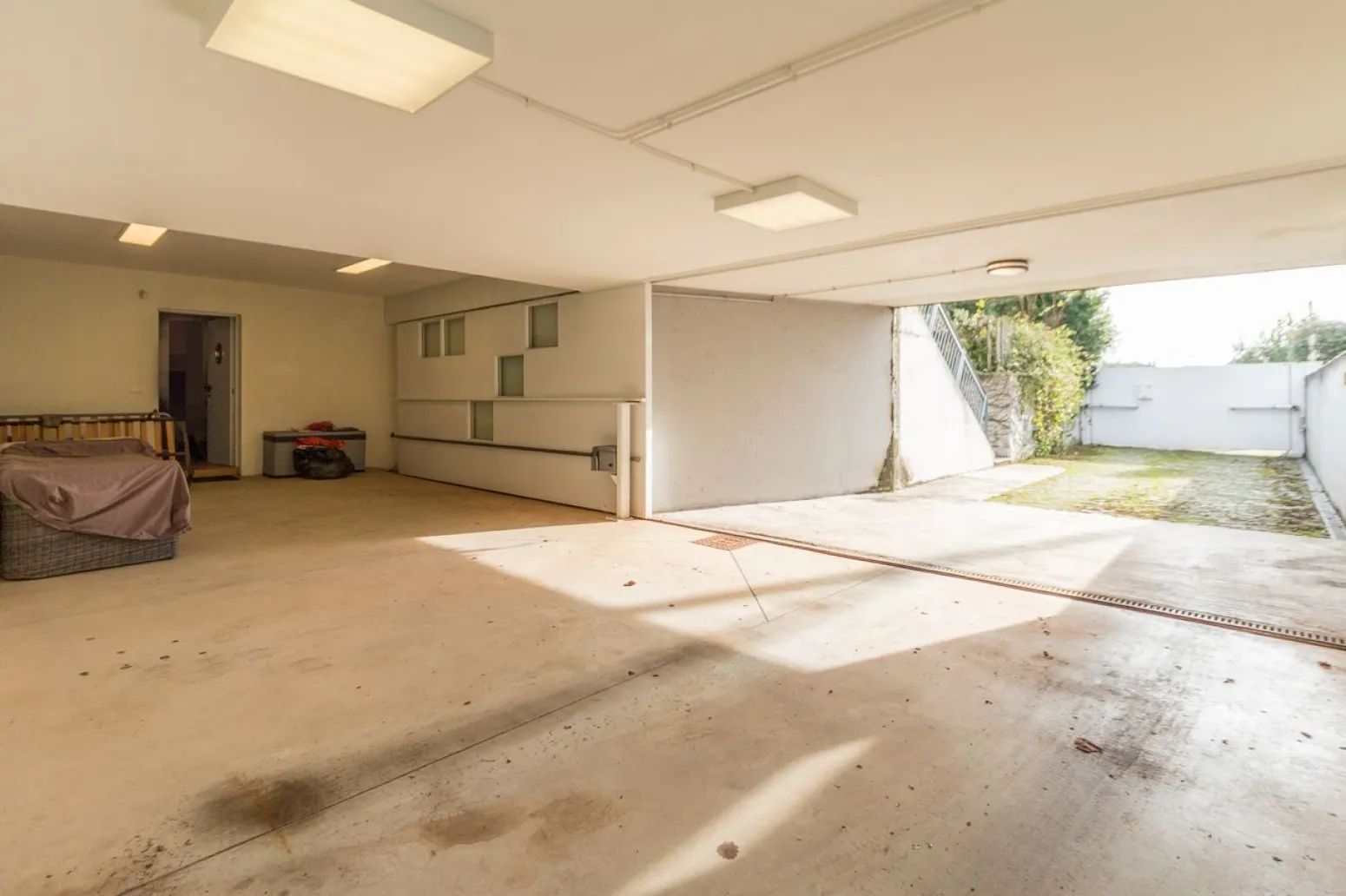Según accedemos a la propiedad tenemos la entrada al garaje con espacio para dos vehículos e integrado, un gran espacio al que puedes dar infinitos usos: trastero, cuarto de juegos, zona de trabajo.... Su techo es la gran terraza junto a la piscina.